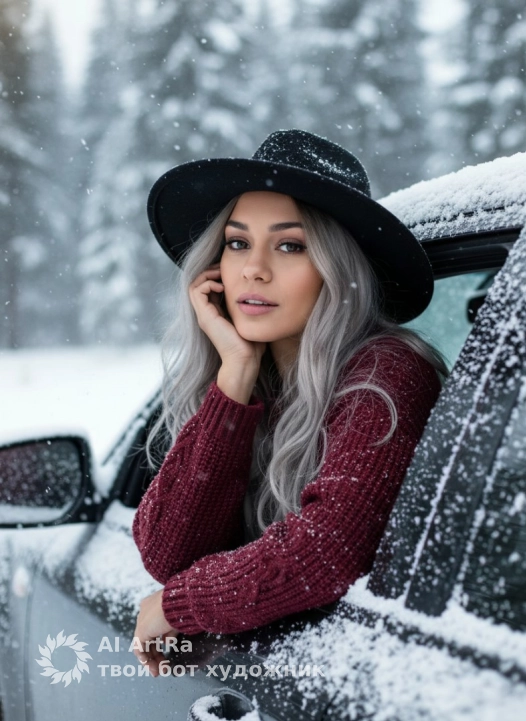 Не меняя внешности женщины с фото, эта сцена запечатлевает момент, наполненный зимним спокойствием и лёгкой загадочностью. Женщина выглядывает из окна автомобиля, частично высунувшись наружу, её лицо обращено к зрителю с лёгким наклоном головы, словно приглашая к близкому диалогу в этом снежном уединении. Глаза её вместе с тонко накрашенными губами создают мягкое, но выразительное впечатление живого и тонко чувственного портрета. Голова украшена широкополой черной шляпой, которая чётко контрастирует с серебристыми прядями её светлых волос, развевающихся на фоне падающего снега. Она одета в тёмно-красный свитер с ярко текстурированными рукавами, точно прочерченными на фоне белоснежного пейзажа, что придаёт образу глубокую насыщенность цвета и уютную теплоту. Рука женщины нежно прикасается к лицу, с пальцами, элегантно расположенными возле щеки, а другой рукой она опирается на раму окна, создавая композицию, полную естественной лёгкости и расслабленности. Автомобиль, покрытый снежным покровом, выступает в кадре как тёмный, немного размытый силуэт, а его поверхность отражает мерцающие снежинки, добавляя нотки таинственности и холодной свежести в общую атмосферу. Фон заполнен размытыми хвойными деревьями, погружёнными в равномерный снежный покров, что подчеркивает глубину пространства и создаёт ощущение бесконечного зимнего леса. Снежинки, падающие и едва уловимые на переднем плане, придают кадру динамику и ощущение моментальной, живой зимней сцены. Свет мягкий и рассеянный, что усиливает обволакивающую атмосферу уюта среди холодного пейзажа, а тени едва заметны за снегом и рассеянным светом. Все детали — от текстур шерсти свитера до нежных завитков волос на ветру и тонкой линии обводки глаз — сохранили реалистичность и живую естественность, точно передавая чувства и настроение образа. Этот момент вечной зимней красоты, уединённости и тихой радости словно пронизан тихой гармонией природы и человеческой теплоты, создавая глубокую, кинематографичную картину, наполненную светом и жизнью, фотореалистичное изображение, высокая текстурная детализация, высокое качество, разрешение 4K.