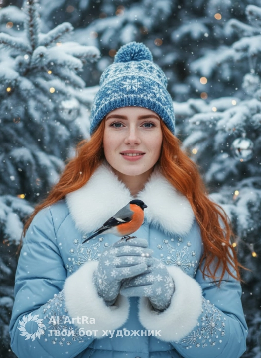Используйте внешний вид пользователя, референса 1:1 — лицо, кожу, волосы и тело без каких-либо изменений. крупный план женщины в пышной зимней куртке нежно-голубого оттенка с белым меховым воротником и манжетами, украшенной тонкими серебристыми узорами и жемчужинами, на голове — вязаная шапка с синими орнаментами и снежинками, на руках — перчатки с вышитыми ледяными узорами, на которых сидит яркий снегирь с серо-оранжевым оперением и чёрной головой. Фон — зимний лес в снегу, с еловыми ветками, покрытыми инеем, мерцающими гирляндами, серебристыми ёлочными шарами и падающими снежинками, создающими ощущение магического мерцания. Освещение мягкое, рассеянное, с холодными голубыми и серебряными акцентами, подчёркивающее праздничную атмосферу. Ракурс — лёгкий нижний угол, фокус на деталях одежды и птицы, с глубоким размытием фона для акцента на главном объекте. Эмоции — тёплая улыбка, излучающая уют и волшебство, атмосфера новогодней сказки с нотками нежности и волшебного ожидания.