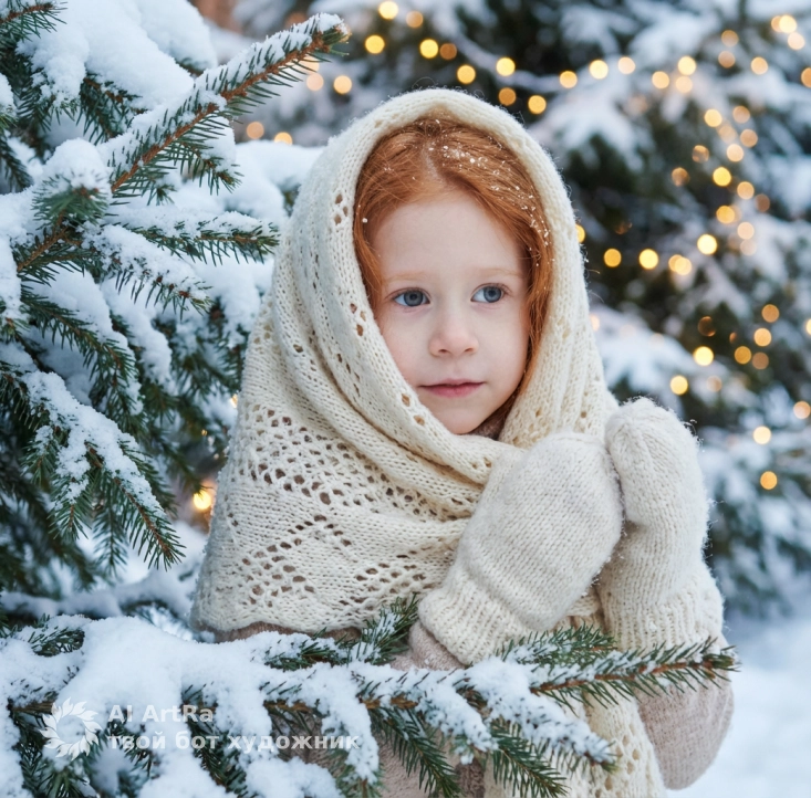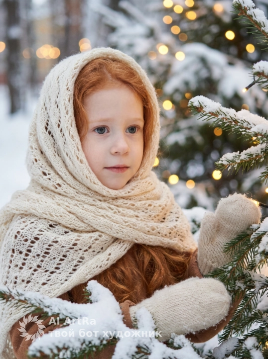 Кадр крупным планом, ребенок с моего фото в кадре по грудь. На фотографии запечатлён зимний пейзаж, наполненный атмосферой уюта и волшебства. В центре кадра — ребёнок с моего фото, укутанный в тёплую одежду: на нём светлый вязаный платок с ажурным узором, который окутывает голову и плечи, а также объёмные варежки в тон. Одежда гармонично сочетается с зимней обстановкой, создавая ощущение тепла даже в морозную погоду.