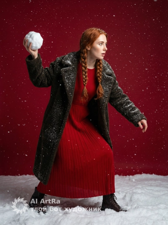 Не меняя внешности женщины с фото, зимняя сцена с падающими снежинками на насыщенном красном фоне, создающим праздничное и динамичное настроение. Она стоит вполоборота, наклонена вперёд, в левой руке поднят большой ком снега, взгляд вправо, выражая сосредоточенность и лёгкое удивление. На ней длинное красное плиссированное платье, плотно облегающее фигуру, и тёмное длинное шерстяное пальто с ворсом, создающим уют и глубину. Мелкий снег на пальто и волосах подчёркивает зимнюю стужу. волосы в двух плотных косах контрастируют с фоном. Обувь — тёмные ботинки, мягкий свет слева создаёт тени, подчёркивающие объём и структуру тканей. Белоснежный пушистый снег с неравномерным покрытием возле ног усиливает естественность. Центрально смещённая фигура акцентирует позу и эмоции. Кадр излучает спокойствие и внутреннюю энергию, словно кинорассказ с драмой и насыщенной палитрой красных, фотореалистичный, высокая текстурная детализация, качество 4K.
