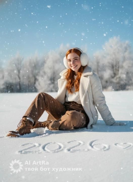 Masterpiece, best quality, ultra-detailed, photorealistic, full-body portrait. A woman from photo with flawless skin and a joyful expression sits in fresh snow in a beautiful, relaxed pose: one leg tucked under her, the other extended, her torso leaning back slightly as she smiles warmly at the camera. Her makeup is light and natural: dewy skin with a soft peach blush, mascara on her lashes, and a glossy lip balm. She wears an open off-white fleece-lined coat over a white knit top, brown cargo pants, brown boots, and fluffy white earmuffs. The entire scene is filled with a gentle snowfall. In the pristine snow directly in front of her, the numbers "2026" and a small heart <3 are clearly written. Bright, natural sunlight illuminates the falling snow and the scene. In the background, bare winter trees stand against a clear blue sky. Style: High-end lifestyle editorial, winter holiday campaign, Vogue-style beauty shot with playful realism. Shot on medium format, prime lens, f/4, 8K.