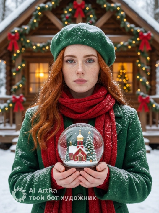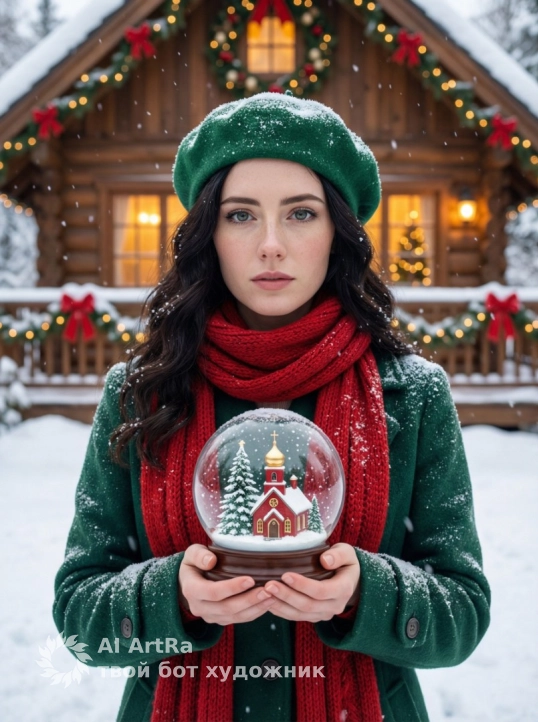 Не меняя внешности женщины с фото, перед нами предстает женщина с выразительными чертами лица, которая держит в руках стеклянный шар с миниатюрной снеговой сценой внутри, включая маленькую красную церковь с золотым куполом и украшенную снегом ель. Ее взгляд направлен прямо на зрителя, создавая ощущение глубокой сосредоточенности и спокойствия. На голове у нее зеленый берет, слегка покрытый снежными хлопьями, которые гармонично оттеняют волосы, свободно ниспадающие на плечи. Широкий красный шарф тепло обвивает шею, создавая яркий контраст с насыщенно-зеленым пальто из плотной ткани, также украшенным снежными крупинками на рукавах и плечах. Свет окружающей среды мягкий и рассеянный, типичный для зимнего дня, при этом сзади видна уютная деревянная хижина, декорированная праздничными гирляндами из зеленой хвои и красных бантов, мерцающими огнями, которые создают теплое, рождественское настроение. Окна здания светятся мягким желтым светом, усиливая чувство уюта и домашнего тепла. Снежная белизна на переднем плане и вокруг женщины вместе с элементами праздничного декора задают атмосферу зимней сказки, наполненной тишиной и ожиданием праздника. Все детали — от текстуры шерстяной ткани одежды до тонких линий миниатюрной церковной архитектуры внутри шара — переданы с высокой точностью и четкостью, создавая объемный, глубокий и визуально насыщенный образ, словно сцена взята из зимнего кинематографического рассказа, фотореалистичное изображение, высокая текстурная детализация, высокое качество, разрешение 4K.