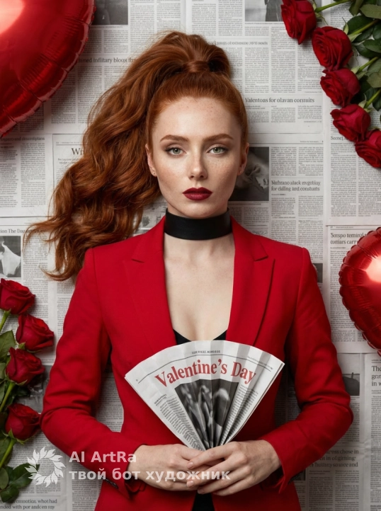 В руках она держит сложенную газету, оформленную как веер, на первой странице крупная надпись красными буквами: «Valentine’s Day». Бумага выглядит реалистично, с заметной текстурой и складками.