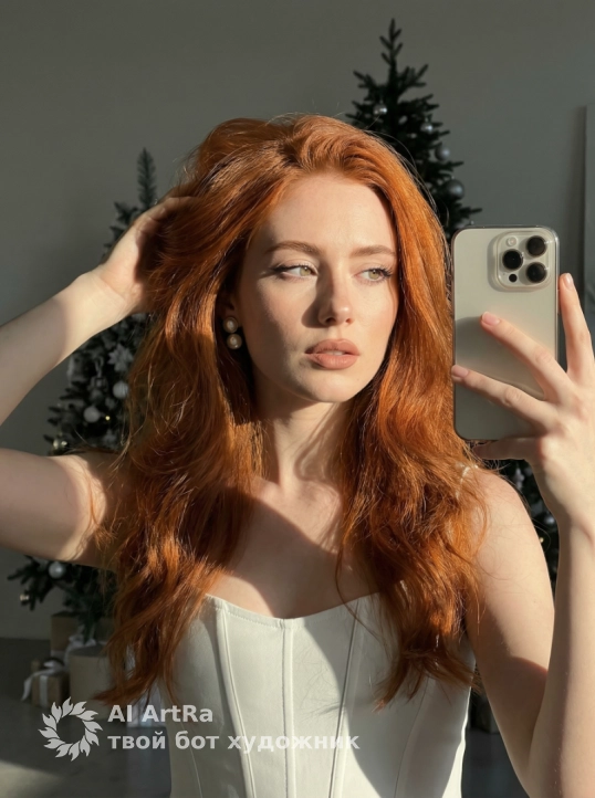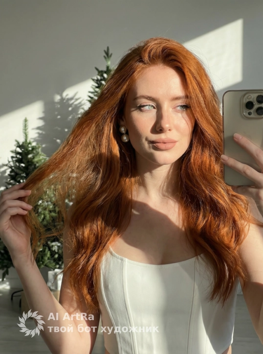 A photorealistic, casual, "selfie" portrait using natural, contrasting light. A young woman with voluminous long hair and round pearl earrings. She has expressive, large eyes with long eyelashes and full lips, painted with nude or light brown lipstick. She looks sideways at the camera. She is wearing a white corset top. One hand may be holding a phone for a selfie, while the other holds her hair back. Bright, direct sunlight falls from the side, creating sharp edges of light and shadow on the wall behind her. Part of her face and hair is brightly lit, while the other is in soft shadow, adding depth and drama to the image. A minimalist New Year's background, part modern