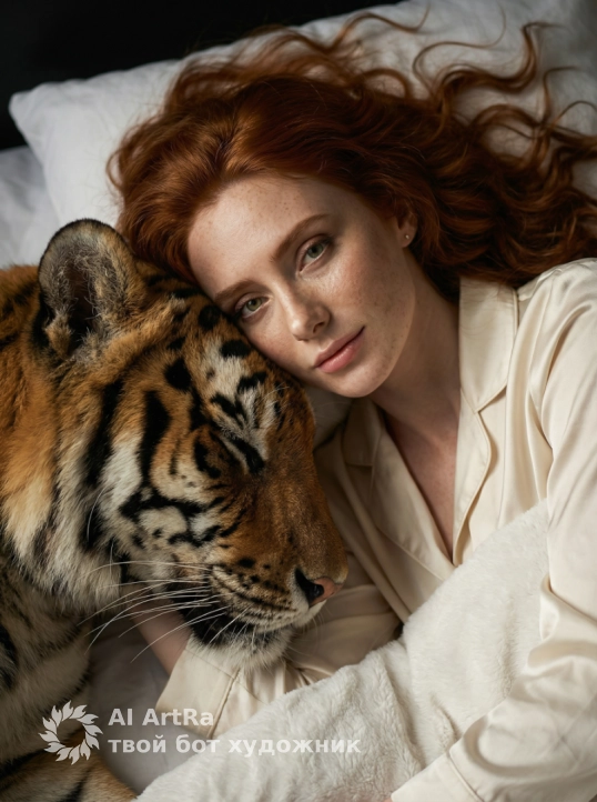 Masterpiece, best quality, ultra-detailed, photorealistic, close-up portrait, Vogue cover style without inscriptions. A woman from photo lies in bed, her face close to a majestic tiger. Her eyes are open, calm, and focused on the viewer, with a subtle smile touching her lips. She wears a simple cream silk pajama top. Her long hair is artfully arranged on the pillow. The tiger has rich orange fur with perfect black stripes, its head resting near hers, eyes closed.