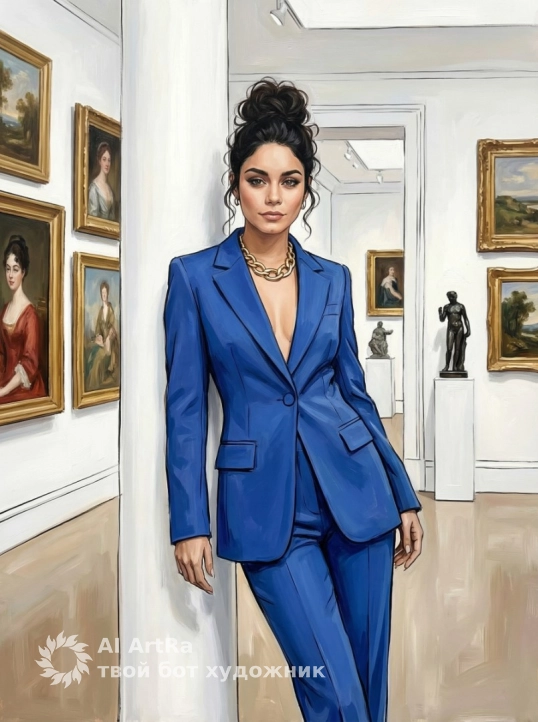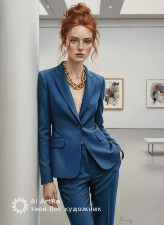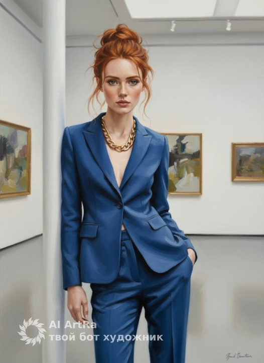 Элегантная,стильная женщина в полный рост, современная высокая мода. Лицо с тонкими чертами, высокая прическа-пучок с выбившимися прядями. На ней приталенный брючный костюм кобальтового цвета и массивное золотое колье-цепь. Она стоит в интерьере светлой арт-галереи, непринужденно опираясь на колонну. Масляная живопись, сочетание мягкой растушевки Харрисона Фишера и графичных штрихов Дэвида Даунтона, реализм, изысканный стиль.Use the user's appearance 1:1 — face, skin, hair and body without any changes.
