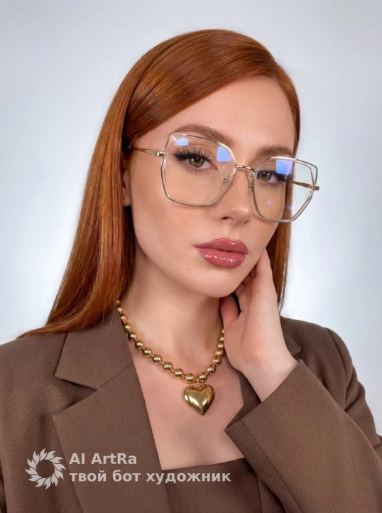 A close-up selfie of a woman posing indoors against a soft light background. She has long, straight hair styled sleek with a deep side part. She wears oversized transparent geometric glasses with metallic frames. Her hand is gently placed on her neck. Makeup is glam and polished: glossy lips, sharp eyeliner, long lashes, even complexion with subtle glow. She wears a chunky gold necklace with round beads and a large heart pendant resting on her collarbone. Outfit: structured brown blazer draped over the shoulders, visible straight neckline underneath. Lighting is bright and direct, creating shiny reflections on glasses and metal surfaces. Camera angle slightly from above, tight crop on face and accessories. Ultra-detailed, high clarity, realistic textures.