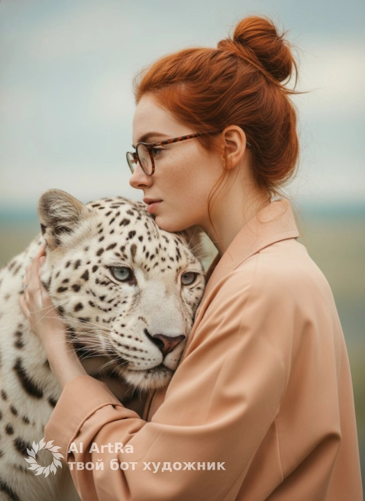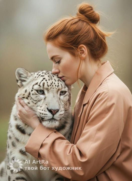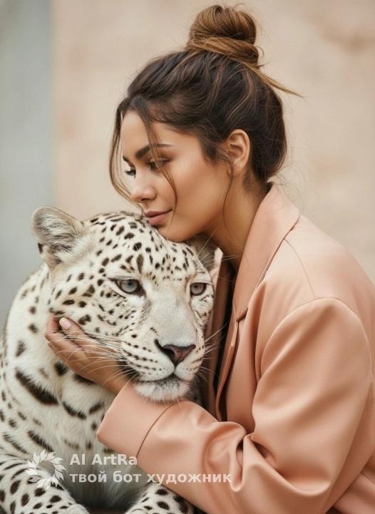 Не меняя внешности женщины с фото, спокойная сцена с мягким светом и приглушённым пастельным фоном, создающим атмосферу уединённости и доверия. Женщина повернута в профиль, опираясь щекой и подбородком на морду белого леопарда с чётким рисунком пятен на густой шерсти. Её лицо выражает спокойствие, глаза полуприкрыты, взгляд в сторону. Светлые волосы собраны в высокий слегка растрёпанный пучок с выбившимися прядями для естественности. На ней свободный жакет персикового цвета с крупными складками и гладкой текстурой, слегка блестящий в свете. Рука в длинном рукаве поддерживает морду леопарда, кисть частично спрятана, пальцы неразличимы. Леопард неподвижен с выразительными светлыми глазами, чётко прорисованной мордой и текстурой густого короткого меха. Мягкое, слегка рассеянное освещение с акцентом на лицо и шерсть, плавные тени без контрастов, придающие глубину и интимность. Композиция подчёркивает связь женщины и дикой природы, тёплые и нейтральные тона создают кинематографичность, ощущение доверия и взаимопонимания, фотореалистичное изображение, высокая детализация, 4K.