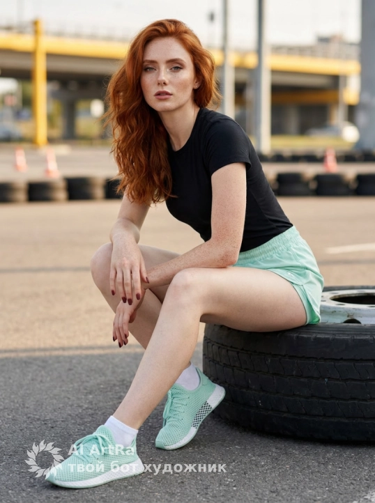Используйте внешний вид пользователя, референса 1:1 — лицо, кожу, волосы и тело без каких-либо изменений. Девушка в спортивной позе сидит на крупной черной автомобильной шине, слегка наклонив корпус вперед, одна нога согнута в колене, другая вытянута вперед, руки свободно лежат на колене и бедре, взгляд прямой и уверенный в камеру. На ней черная облегающая футболка с короткими рукавами, светло-мятные спортивные шорты, белые носки и кроссовки в тон шортам с текстурной сетчатой поверхностью и белой подошвой. Макияж естественный, с акцентом на четко очерченные брови, легкий контур губ и едва заметный блеск на веках. Маникюр — короткие ногти с матовым покрытием в оттенке красного винного. Окружение — уличная площадка с брусчаткой, в фоне размытые желтые и серые элементы городской инфраструктуры, дорожные конусы и ряды шин. Стиль — фотореализм с мягким естественным дневным освещением, легкой тенью от фигуры, теплыми тонами и глубоким размытием фона (боке). Композиция — средний план, ракурс немного снизу, камера на уровне пояса, акцент на силуэте и текстурах одежды и шин. Атмосфера — спортивная, уверенная, городская, с элементами уличного стиля и динамичной энергии.
