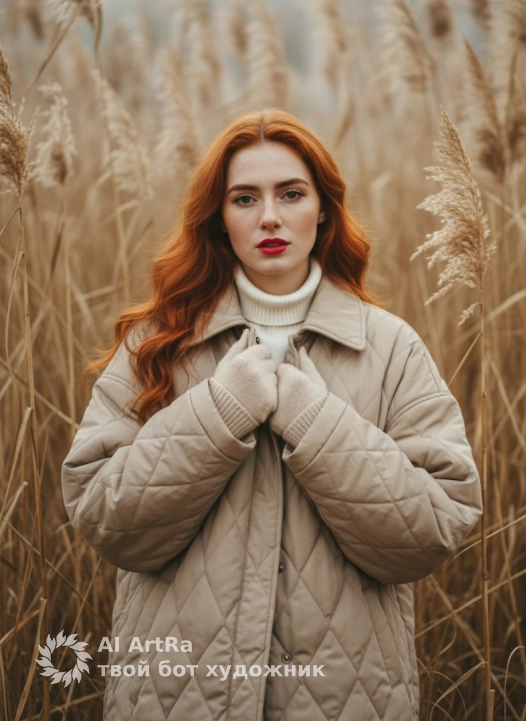 Не меняя внешности женщины с фото, перед нами предстает молодая женщина с волосами, искусно спадающими на плечи. Она стоит в окружении высоких сухих тростников и трав, создающих природный фон зимне-осенней палитры с бежевыми и коричневыми оттенками. Ее взгляд направлен прямо в камеру, выражая спокойствие и легкую задумчивость, а яркая алого цвета помада придает лицу выразительность. На ней надета теплая светлая куртка с широкими объемными рукавами из мягкого материала, под которой виднеется водолазка или кофточка с высоким воротником белого цвета. Руки женщины покрыты светлыми перчатками из шерстяной ткани, которые она аккуратно прижимает к груди, создавая ощущение уюта и защиты от прохлады. Свет мягко обволакивает ее лицо и одежду, подчеркивая текстуры ткани и натуральную структуру волос, придавая композиции ощущение глубины и тепла в прохладную пору. Легкая дымка и приглушенный, слегка теплый тон кадра придают фотографии атмосферу тишины и умиротворения на природе, где каждая деталь гармонично сливается с окружающей средой, сохраняя индивидуальность модели. Общий свет сбалансирован, с мягкими тенями, которые аккуратно очерчивают силуэт фигуры, сохраняя естественность и живость изображения, фотореалистичное изображение, высокая текстурная детализация, высокое качество, разрешение 8K.