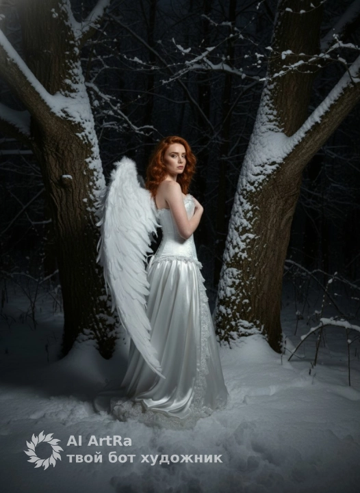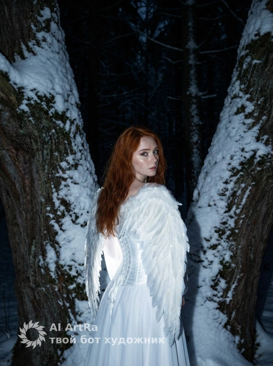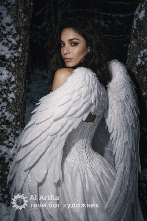 Dark forest photography, a white angel standing between two ancient, snow-covered trees at night. She is looking back over her shoulder with a mysterious expression. Her huge wings are partially wrapped around her like a cloak. She wears a glowing white Victorian corset dress. The direct flash creates deep shadows in the background forest, making her stand out vividly. 8k resolution, hyper-realistic,Use the user's appearance 1:1 — face, skin, hair and body without any changes.