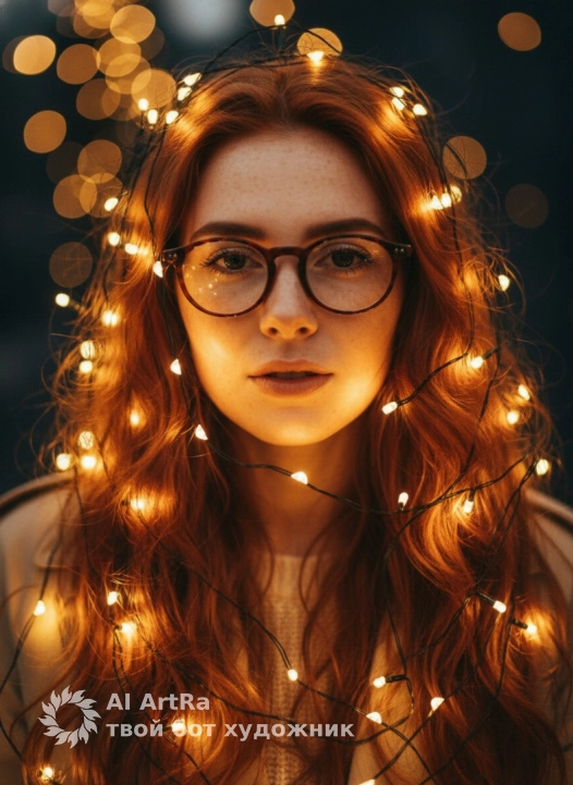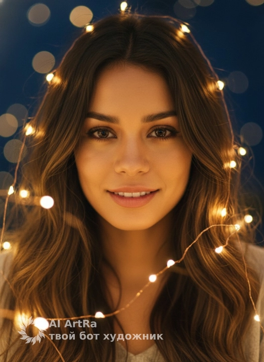 Не меняя внешности женщины с фото, внимание сосредоточено на крупном плане её лица, окружённого мягким теплым светом гирлянд, которые создают вокруг неё атмосферу уюта и загадочности. Её кожа сияет с естественным блеском, отражая желтоватые огоньки, что придаёт портрету живую теплоту и объемность. Лёгкая небрежность светлых волос, перемешанных с тонкими проводками гирлянд, обрамляет её выразительные глаза и губы, придавая образу особую чувственность и интригу. Глаза женщины смотрят прямо в кадр, их глубокий взгляд подчеркивается мягкими тенями и мерцанием света, создавая эффект живого общения и внутреннего света. На фоне тёмно-синего пространства из размытых точек светового отражения формируется ощущение ночного, почти магического пространства, в котором она словно плавает. Вся композиция пронизана золотисто-янтарными оттенками, которые мягко подчеркивают контуры лица и текстуру кожи, поднимая настроение и погружая в атмосферу интимного, тёплого мгновения. Отсутствуют видимые детали одежды, за исключением неразличимых отблесков ткани, лишь оттеняющих общий тёплый художественный образ, что усиливает фокус на лице и игре света. Эффект кинематографической глубины достигается контрастом ярких огоньков и глубоких мягких теней, что создаёт ощущение живого, объёмного пространства вокруг модели, наполненного теплом и лёгкой таинственностью, фотореалистичное изображение, высокая текстурная детализация, высокое качество, разрешение 4K.