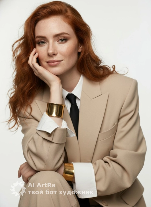 Не меняя внешности женщины с фото, изображена она в спокойной позе с лёгкой улыбкой и взглядом в камеру, создавая ощущение уверенности и гармонии. волосы свободно спадают на плечи и грудь, контрастируя с мягким светом, который подчёркивает глаза и брови. Женщина слегка наклоняет голову, опираясь правой рукой на щёку, что добавляет естественности. На ней светло-бежевый свободный жакет с большими лацканами и объёмными рукавами, под которым видна часть белой рубашки с широкими подвернутыми манжетами. Широкие золотистые металлические браслеты на обоих руках блестят в свете. На шее узкий чёрный галстук, дополняющий строгий, элегантный стиль. Фон белый, нейтральный, сосредотачивает внимание на женщине и её лице. Мягкие тени от переднего света подчёркивают текстуру ткани и гладкость кожи. Композиция — тщательно продуманный портрет с утончённой сдержанностью и чётким стилем. Фотореалистичное изображение, высокая детализация, демонстрируй поры лица . 4K.