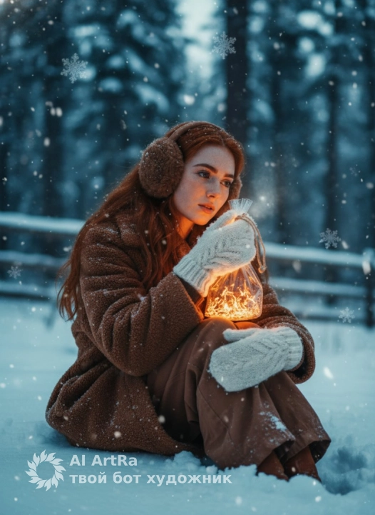 Используйте внешний вид пользователя, референса 1:1 — лицо, кожу, волосы и тело без каких-либо изменений. Зимняя сцена в снежном лесу: молодая женщина в коричневой плюшевой куртке, вязаных белых перчатках и меховых наушниках сидит на сугробе, обхватив колени, с легким наклоном головы в сторону, одна рука приподнята к лицу. В ладонях она держит прозрачную сетчатую сумку, внутри которой мерцает теплое оранжевое свечение, словно тлеющие угли, создавая контраст с холодной синевой падающего снега. Фон: размытые темные силуэты елей, деревянный забор, покрытый снегом, с крупными снежинками в воздухе. Стиль — гиперреалистичная фотография с мягким боке, глубоким фокусом на лице и сумке, низкий ракурс с акцентом на текстуру снега и ткани. Освещение: естественный дневной свет, дополненный теплым свечением сумки, передающим ощущение уюта в морозной тишине. Атмосфера — сказочная, задумчивая, с легкой ностальгией, словно момент остановленного времени в зимнем лесу. Детали: складки на куртке, снежинки на перчатках, отражение света в глазах, едва заметный пар от дыхания.