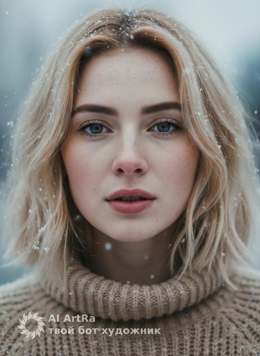 Не меняя внешности женщины с фото, перед нами изящный крупный план её лица, частично прикрытого лёгкими, слегка взъерошенными волосами, которые нежно обрамляют её черты, придавая образу особую воздушность и мягкость. Снежинки, медленно опадающие на её волосы и лицо, создают ощущение зимней свежести и хрупкой красоты, подчеркивая её естественные черты — кожу с нежным румянцем и легкими веснушками, чуть подсвеченную холодным рассеянным светом, который смягчает тени и наполняет картину ясностью и прохладой. Её глаза голубого оттенка смотрят прямо в объектив, выразительные и слегка задумчивые, с игрой мягких бликов, что добавляет глубины взгляду. Губы, чуть приоткрытые, имеют натуральный розовый оттенок с матовой текстурой, будто она собирается начать говорить или поймать дыхание на морозе. На шее виден высокий свитер с рыхлой вязаной текстурой теплого бежевого цвета, покрытый легким слоем снега, что гармонирует с общей атмосферой зимней стужи и создает контраст с нежностью лица. Свет, исходящий сверху и слева, подчеркивает тонкую структуру кожи и прорисовывает каждую деталь лица, добавляя снимку кинематографическую глубину и объем, в которой фиксируется мгновение неподвижной красоты на фоне размытых снежинок. Фон за пределами кадра неразличим, усиливая эффект сосредоточенности на лице, которое занимает центральное место в композиции и вызывает чувство спокойствия, лёгкого волнения и надёжности одновременно. Всё вместе напоминает сцена из зимнего фильма с теплым, но свежим естественным освещением, в котором природная красота и холодная погода сливаются в уникальную атмосферу, передаваемую с максимальной реалистичностью и детализацией, фотореалистичное изображение, высокая текстурная детализация, высокое качество, разрешение 4K.