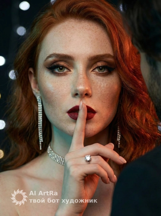 The woman holds her index finger vertically in front of her lips in a gesture of silence and looks directly into the camera. The close-up is on her face and hand, at an eye-level angle. The shoulders and part of the back of the second person on the right in the frame are blurred and filled with a dark mass, creating the impression of their partner's presence in the frame.