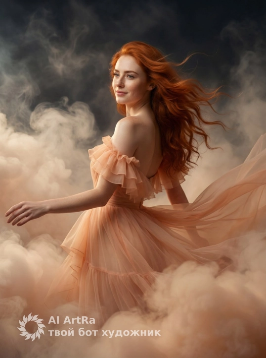 Не меняя внешности женщины с фото, перед нами предстает юная женщина в движении, окутанная воздушной дымкой, словно парящей в облаках. Она грациозно повернула тело слегка влево, одна рука вытянута сбоку, добавляя динамики и элегантности композиции. Ее волосы развеваются, словно легкий ветер треплет золотистые нити, что придает образу живость и легкость. На ней воздушное платье персикового оттенка из многослойного шифона или тюля с рюшами на плечах, которые нежно обрамляют плечевой контур, открывая безупречно гладкую кожу. Материал платья кажется полупрозрачным и мягким на ощупь, складки струятся и волнами ниспадают, создавая объем и движение, словно растворяясь в густой дымовой подушке, которая будто парит вокруг и усиливает сказочную атмосферу. Свет падает преимущественно слева, мягко подсвечивая лицо и плечо, выделяя тонкие черты и теплый тон кожи, при этом тени плавно очерчивают контуры, не создавая резких контрастов, что делает изображение гармоничным и утонченным. Фон состоит из глубокой темной дымки с переходами в более светлые облака, создающих ощущение пространства и эфемерности, в которых явно прослеживается игра света и тени, добавляющая визуальный интерес. Выражение лица женщины спокойное, слегка улыбающееся, с чуть приподнятыми бровями и улыбкой, которая вызывает чувство уверенности и непринужденности одновременно. Все детали скрупулезно переданы с сохранением естественной индивидуальности женщины, создавая ощущение живого портрета в динамике, где каждый элемент дополняет сказочную сцену. Такая композиция, освещение и тоновые решения напоминают классическую кинематографическую постановку с акцентом на мягкость и воздушность, а дым и многослойное платье усиливают феерическую и романтичную атмосферу, фотореалистичное изображение, высокая текстурная детализация, высокое качество, разрешение 4K.