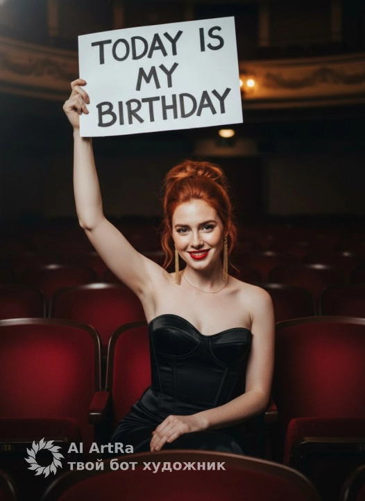 A photo of a woman holding a sign that says "TODAY IS MY BIRTHDAY" poses in a classic theater hall, looking at the camera while seated in a chair. Medium shot, dynamic pose, angle at eye level. Makeup with bright red lipstick. Hair is styled in a high, voluminous bun. She is wearing a black satin corset top, and the top of her black satin skirt is visible. Her left hand holds a large cardboard sign above her head that reads "TODAY IS MY BIRTHDAY" in all capital black letters, written carelessly by hand with a black marker. She is wearing long gold chain earrings and a delicate gold necklace. Indoors, in a vintage, luxurious theater hall, rows of classic red velvet chairs recede into darkness. Dramatic, cinematic subdued lighting. A focused spotlight illuminates the woman and her sign, creating bright highlights. The rest of the theater is immersed in deep shadow. Shot with an 85mm portrait lens, the shallow depth of field offers sharp focus on the woman and the sign, and creamy bokeh from the distant seats. Используйте внешность пользователя 1:1 — лицо, кожу, волосы и тело без каких-либо изменений.
