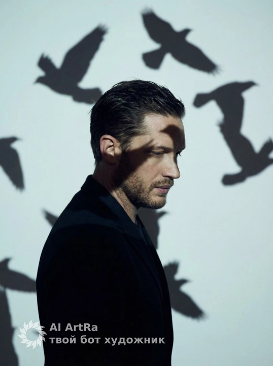 Мужчина в простой тёмной одежде стоит боком к камере у светлой стены, опустив взгляд, а на его тело и фон проецируются крупные силуэты летящих птиц — чёткие тёмные тени крыльев скользят по его лицу, плечам и стене за спиной, создавая атмосферу мечтательности, свободы и лёгкой задумчивой меланхолии.
