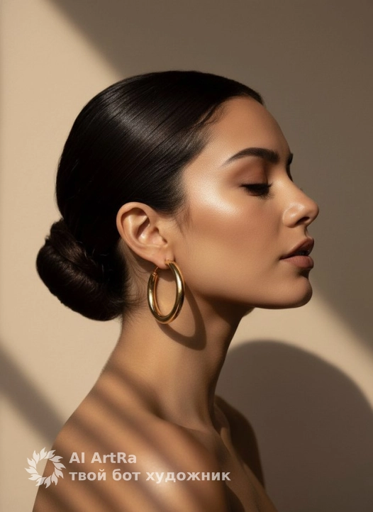 Close-up portrait of a woman showing only her head and shoulders, in profile, head tilted slightly back, eyes closed, sleek pulled-back hair in a low bun, voluminous gold hoop earrings, bare shoulders, highly detailed, photorealistic image, harsh bright daylight with dramatic shadows from blinds on face and neck, strong contrast lighting, side lighting, focus on matte skin and neutral glossy nude lips, professional high fashion editorial photo, 8K resolution, shallow depth of field, against a smooth beige wall.