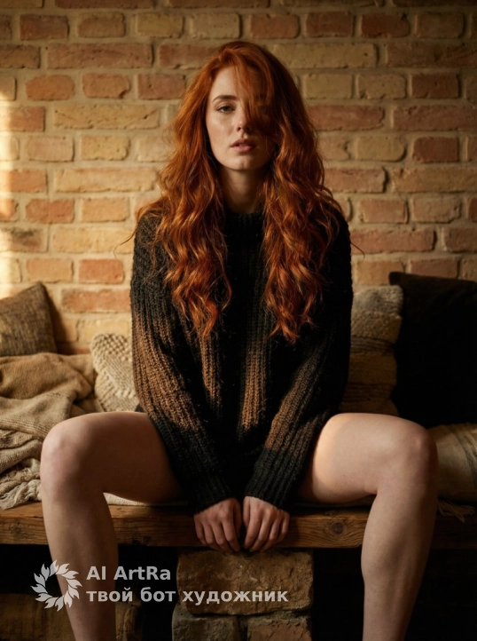 Не меняя внешности женщины с фото, в атмосфере теплого и слегка грубоватого уюта, созданного фактурной кирпичной стеной с оттенками терракоты и светло-коричневого, она сидит на деревянной скамье с кусками грубо обтесанного камня внизу. Женщина расположилась широко, ноги согнуты в коленях и расставлены, придавая образу расслабленную и вместе с тем уверенную позу. Ее руки сцеплены в замок и покоятся между бедер, создавая композиционное равновесие. Верхняя часть тела свободно наклонена вперед, подчеркивая черты лица и густые, волнисто завитые волосы, которые ниспадают каскадом по плечам, частично скрывая глаза и придавая загадочность взгляду. Волосы имеют текстуру мягко обработанных локонов, светлые с едва заметными переходами оттенков, что создает объем и игру света. Она одета в объемный темный свитер из грубой вязки, который контрастирует с гладкостью и светом кожи на ногах и руках. Свет поступает слева, подчеркивая фактуру свитера и создавая мягкие тени на изгибах тела, постепенно переходя в более глубокий полумрак с правой стороны кадра, что усиливает эмоциональный настрой фотографии. За спиной женщины видны разнофактурные подушки и предметы с текстурой ткани, добавляющие домашний уют. Композиция кадра построена так, что стройные ноги занимают нижнюю часть, а выразительная верхняя часть со взглядом и волосами – центральную, создавая драматичную игру света и тени. Общее настроение пропитано теплотой и интимной простотой, в которой сочетаются необработанная грубость кирпичной стены и мягкость человеческого образа, воплощенного в этой живой позе. Это поэтический момент, где кинематографическая глубина и цветовые полутона создают насыщенную и пленительную визуальную историю, фотореалистичное изображение, высокая текстурная детализация, высокое качество, разрешение 4K.