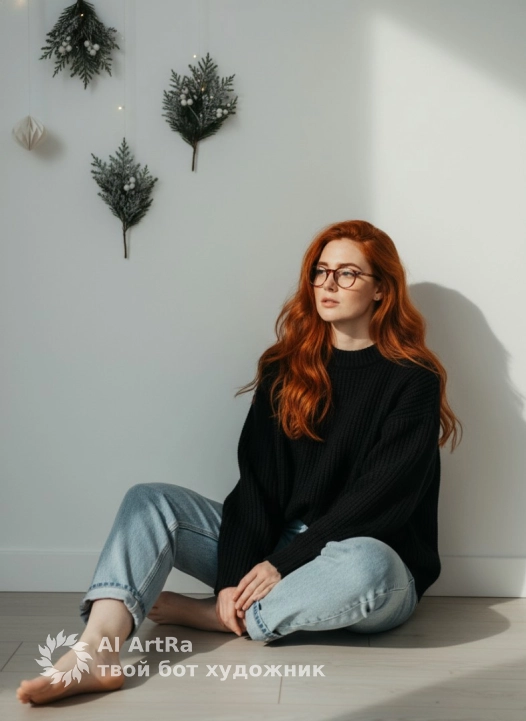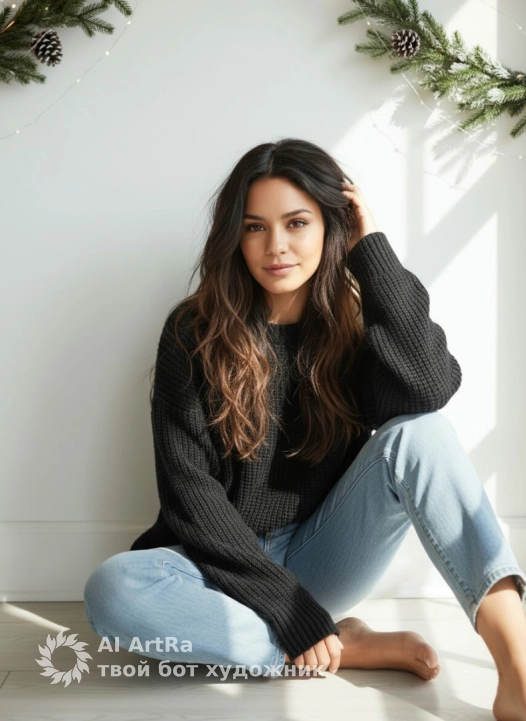 She sits on the floor near a white wall decorated with minimal evergreen branches and soft winter accents.