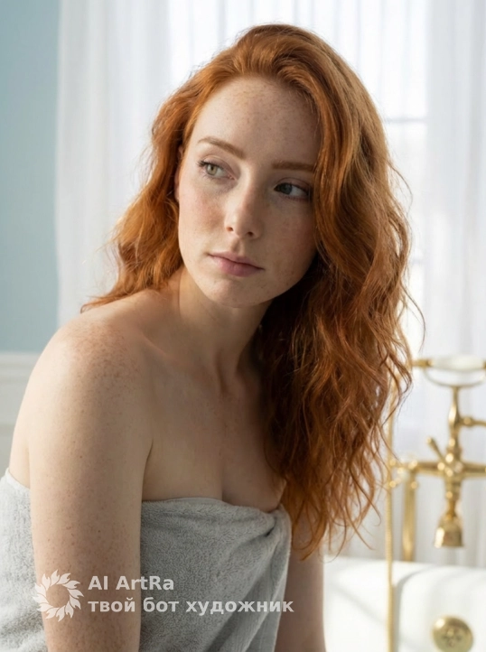 Используйте внешний вид пользователя, референса 1:1 — лицо, кожу, волосы и тело без каких-либо изменений, с естественным, почти незаметным макияжем, подчеркивающим мягкость черт: легкий румянец на щеках, едва заметный блеск на губах, тонкая стрелка на верхнем веке и приглушенная тени на подвижном веке; маникюр — короткие, аккуратно ухоженные ногти с прозрачным или нюдовым лаком; украшений нет; главный объект — женщина, сидящая на краю белой ванной, обернутая в светло-серое мягкое полотенце, слегка наклонившаяся вперед, левая рука опирается на край ванны, правая касается воды; стиль — фотореализм, с мягким, рассеянным естественным освещением, создающим нежные тени и блики на коже и воде; фон — светлая ванная комната с пастельно-голубыми стенами, белой панелью внизу, золотистым смесителем и белой шторкой справа; цветовая гамма — спокойная, холодно-нежная, с акцентом на голубые, белые и золотистые тона; камера — средний план, снятый с небольшого ракурса сбоку и чуть снизу, акцентируя позу и взаимодействие с водой; композиция — сбалансированная, с ванной как центральным элементом, женщина занимает левую и центральную часть кадра; атмосфера — умиротворенная, интимная, расслабленная, с ощущением тишины и личного пространства; одежда — только полотенце, плотно обернутое вокруг тела; поза — расслабленная, с легким наклоном корпуса вперед, взгляд опущен вниз, к воде, выражает спокойствие и сосредоточенность.