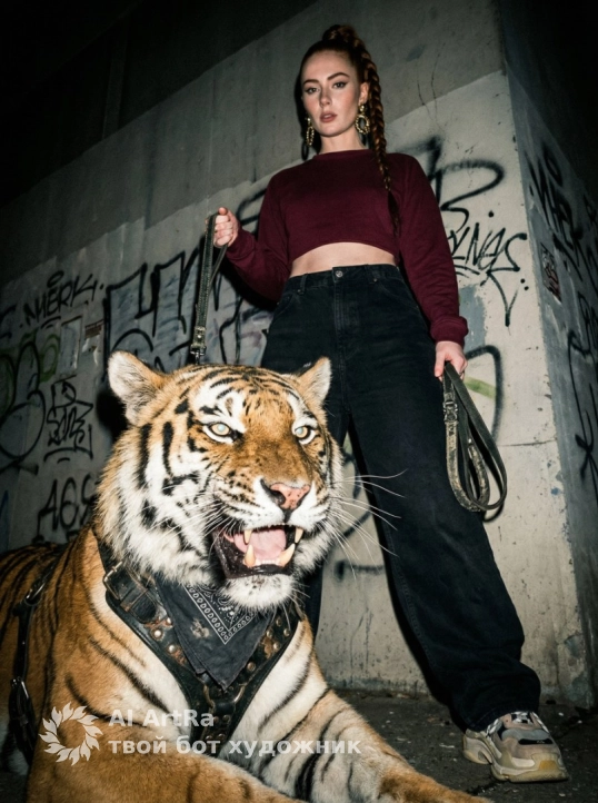 с потускневшими металлическими заклепками, его маленькая выцветшая черная бандана плотно завязана под подбородком. Челюсть приоткрыта в полуобморочном оскале, глаза пронзительно сверкают. За ним, возвышаясь в кадре, неподвижно стоит свирепый и стильная женщина, одета в жерные оверсайз джинсы багги , бордовый укороченный лонгслив, гладкий высокий хвост заплетенный в косу, на ушах массивные серьги золотого цвета , на ногах очень объемный кроссовки, она небрежно сжимает в одной руке оба поводка с непринужденным видом доминанта. На заднем плане - стена с несколькими граффити.