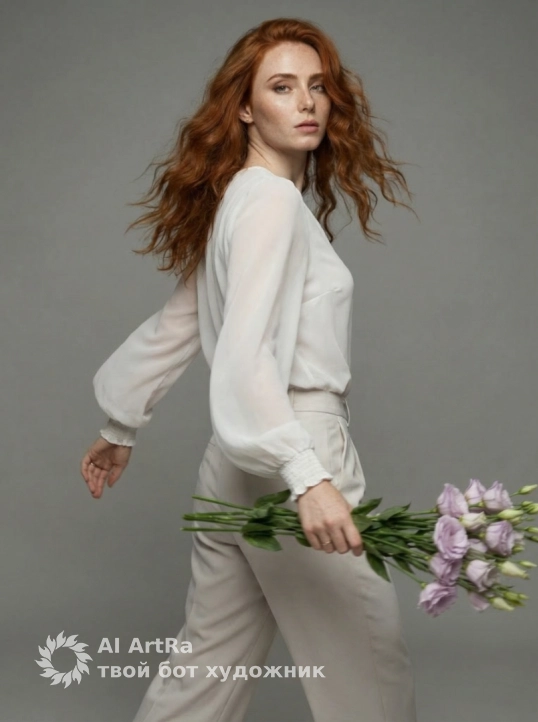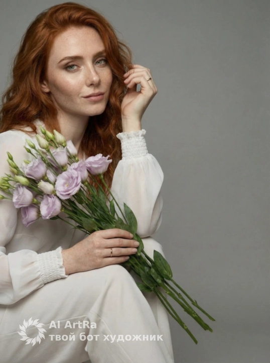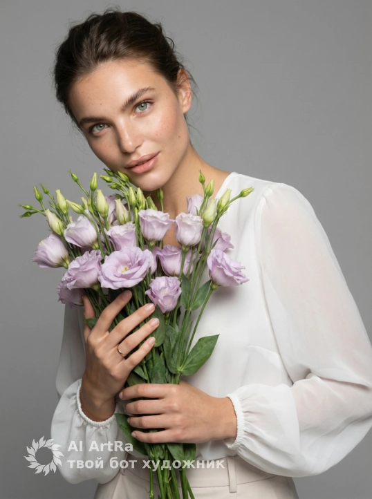 Используйте внешний вид пользователя, референса 1:1 — лицо, кожу, волосы и тело без каких-либо изменений. На изображении — женщина в элегантной позе, слегка наклонившаяся вперед, с мягким, теплым взглядом, направленным прямо в камеру, держащая в руках пышный букет нежно-лиловых эустом с зелеными стеблями и бутонами; макияж естественный, с акцентом на выразительных бровях и тонком контуре губ, ногти ухоженные, короткие, без лака, на пальце левой руки — тонкое золотое кольцо; одета в белую прозрачную блузу с объемными рукавами и эластичными манжетами, подчеркивающую изящество движений, и светлые брюки; фон — однотонный серый студийный, освещение мягкое, рассеянное, студийное, с легким боке на заднем плане, создающее атмосферу утонченной нежности и спокойствия; стиль — высокий реализм, цифровая фотография с тонкой обработкой, композиция — средний план, фокус на лице и букете, ракурс — фронтальный с легким поворотом корпуса, камера на уровне глаз, масштаб кадра — от пояса вверх, акцент на эмоциональной связи с зрителем и гармонии с цветами.