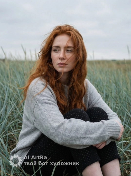 A woman sits in a field of tall, thin grass. She is seated with her knees drawn up to her chest and her arms wrapped loosely around them. Her gaze is directed slightly to the side with a calm, introspective expression.