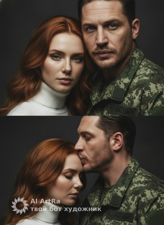 Она одета в белую водолазку, он в военную форму России (цвет мультикам )