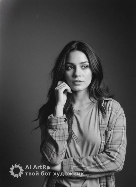 High-resolution black-and-white portrait art piece in a studio. Half-body shot with natural and coordinated movements, close-up focus on the face. Clothing and gestures reflect an urban casual style. Atmosphere is deep but not contrived — quiet, gentle, and introspective. Background features a soft gradient for depth and layering, evoking a silent mood. Subtle film grain adds a tactile, analog-photography texture reminiscent of classic black-and-white portraiture. Gentle directional light diffuses softly, highlighting facial contours and creating subtle glints in the eyes — the emotional core of the portrait. Large areas of negative space are left deliberately simple, allowing the image to breathe. No words, logos, or distractions — only light, shadow, and emotion intertwined. Styled like a top-tier photographer’s portrait, with a non-centered composition.