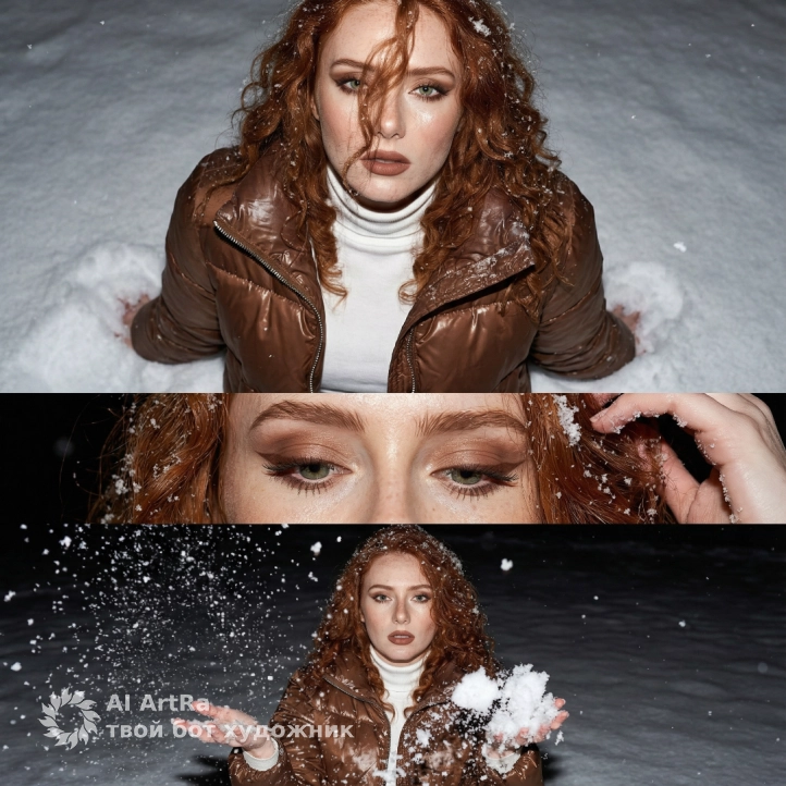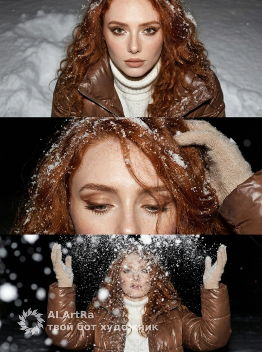 Нижний кадр: та же девушка с той же прической и одеждой подкидывает снег вверх над собой, снег на переднем плане Use the user's appearance 1:1 — face, skin, hair and body without any changes.