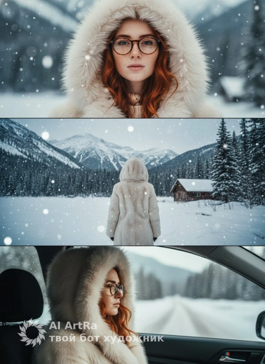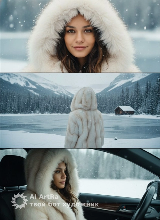 Bottom frame: a medium shot inside a car, where I sit by the window in the same fur coat, soft natural light entering through the window, reflecting the serene snowy landscape outside.