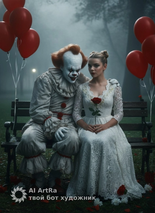 A scene depicting Penny Wise, the clown from the film It, in a vintage costume, interacting with a woman holding a red rose. The woman looks at the camera and the clown looks at the woman. A medium close-up shoot . They sit on a bench in a foggy park at night. The woman wears a white lace dress with detailed embroidery. The image is set among numerous red balloons and scattered flowers in a dimly lit night park. The lighting is subdued, with dramatic cinematic intensity creating sharp contrasts and enhancing the eerie atmosphere. The overall atmosphere is mysterious and slightly ominous. Highly detailed photography on a 50mm lens ensures the costumes and surrounding elements are clearly captured. The background is blurred with a bokeh effect. The photorealistic style and color palette, dominated by red and dark green, create a vibrant yet captivating visual image. Используйте внешность пользователя 1:1 — лицо, кожу, волосы и тело без каких-либо изменений.