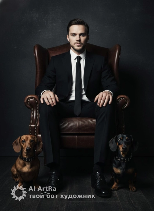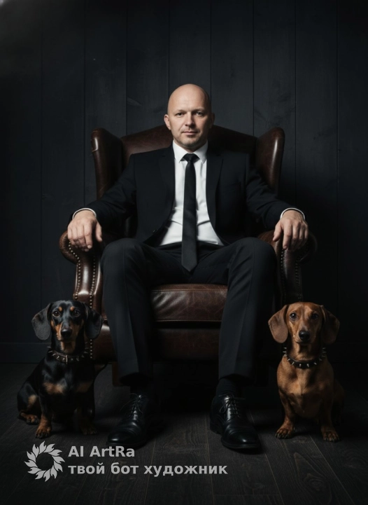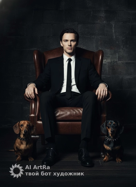 Фотография мужчины, сидящего в высоком кресле из коричневой кожи, рядом с которым с одной стороны сидит коричневая такса, а с другой чёрная такса . Кадр по пояс, с головы до колен, собаки на полу. Композиция центральная и симметричная. Мужчина одет в черный классический костюм, хрустящую белую рубашку и черный галстук, на нем начищенные черные туфли. Рядом с ним с одной стороны сидит такса с черно-подпалой шерстью и ошейником с шипами, а с другой стороны рыже коричневая такса и ошейником с шипами. Фон — темная текстурированная стена и темный деревянный пол. Драматическое кинематографическое освещение из скрытого источника, боковой свет, акцентирующий фигуру. Резкие тени и четкие контрасты. Мрачная атмосфера. Снято на 85-мм портретный объектив, малая глубина резкости. Фотореалистичный стиль с проработкой текстур, разрешение 8K. Цветовая палитра: черный, коричневый, темные тона. Высокая детализация. Use the user's appearance 1:1 — face, skin, hair and body without any changes.