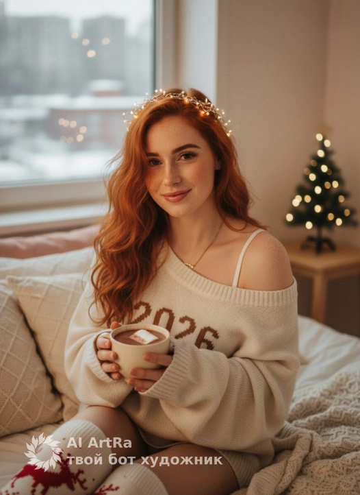 • Одежда: мягкий кремовый свитер оверсайз ZARA с новогодним принтом «2026», рукава спущены на плечи, под ним белая майка H&M. На ногах — тёплые носки с оленями.
