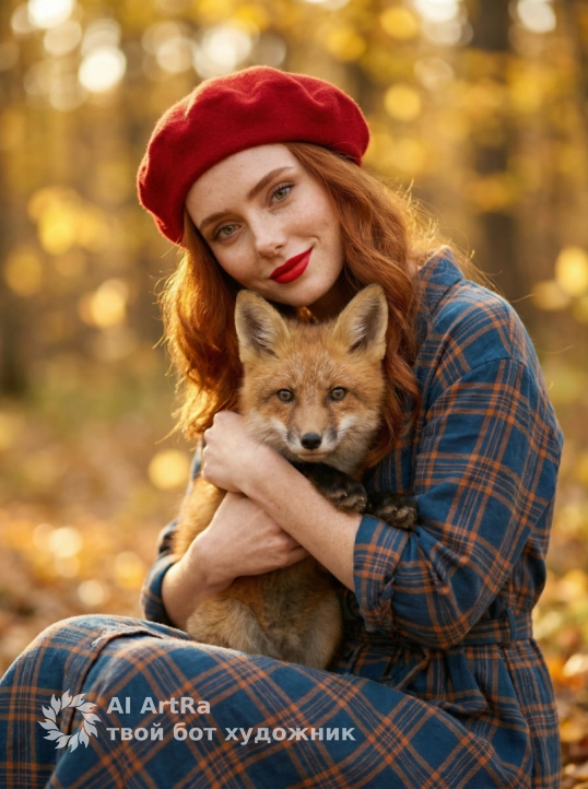 Используйте внешний вид пользователя, референса 1:1 — лицо, кожу, волосы и тело без каких-либо изменений. На изображении — женщина в красной берете, сидящая в полупрофиль, слегка наклонившись вперёд, с ласковой улыбкой, держащая на руках пушистого лисёнка, который смотрит прямо в камеру с любопытством; она одета в свободное платье в клетку сине-оранжевых тонов, рукава слегка заправлены; макияж естественный, с акцентом на ярко-красные губы и подчёркнутые брови, ногти короткие, без маникюра, украшений нет; фон — размытый осенний лес с золотистыми бликами солнечного света, мягкий боке создаёт уютную атмосферу; освещение тёплое, боковое, подчёркивающее объём и текстуру шерсти лисёнка и ткани платья; стиль — гиперреалистичная цифровая фотография с мягким фокусом на лице и животном, композиция — средний план, ракурс немного снизу, камера на уровне глаз, создавая ощущение интимного, тёплого и волшебного момента.