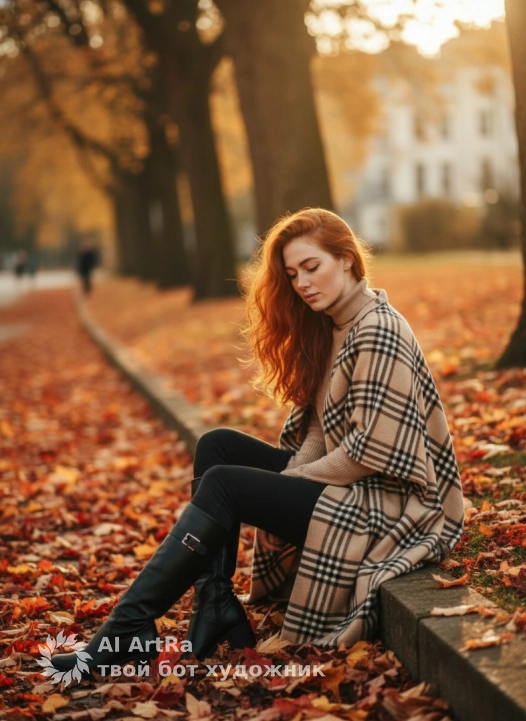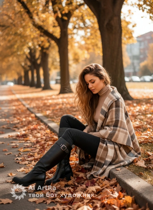 Не меняя внешности женщины с фото, она сидит на бордюре тротуара в осеннем парке, окружённая опавшими красно-жёлтыми листьями, которые создают тёплую атмосферу. Тонко сложенная фигура повернута в три четверти к камере, её взгляд опущен вниз, словно она задумалась или наслаждается моментом уединения. Она одета в облегающую водолазку бежевого оттенка, аккуратно подчеркивающую формы, и поверх накинута уютная крупная клетчатая накидка, в которой доминируют тёплые тона – бежевые, коричневатые и чёрные полосы, ткань которой мягко обвивает плечи и спускается к земле, создавая плавное, текущее движение ткани. На ногах у неё тёмные облегающие брюки, плотно облегающие ноги, переходящие в высокие чёрные кожаные ботинки с массивным каблуком и характерной металлической деталью на голенище, придающей образу современный акцент. Её длинные светлые волосы свободно раскинуты и слегка развеваются от лёгкого ветерка, добавляя лёгкости и динамики кадру. Солнечный свет пробивается сквозь густую листву деревьев позади, образуя золотистый ореол и мягко освещая лицо женщины, создавая тёплую, почти магическую атмосферу позднего осеннего дня. Фон немного размытый, с подчеркнутыми крупными стволами деревьев и домами, что усиливает глубину кадра и подчёркивает основное внимание к фигуре женщины, оставляя ощущение покоя и гармонии с природой. Осенние цвета, сияющее солнце и естественное освещение создают эффект пленительного момента задумчивости и уюта, словно сцена из тихого фильма о перезагрузке души на лоне природы, фотореалистичное изображение, высокая текстурная детализация, высокое качество, разрешение 4K.