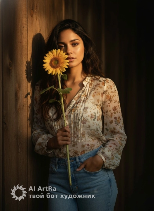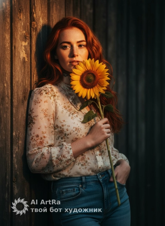 Ultra-realistic cinematic portrait of a young woman standing outdoors, leaning gently against an old wooden wall in soft directional evening light. She holds a single sunflower close to her face, the petals illuminated by a warm spotlight that softly highlights her facial features. Her expression calm and serene, with a natural relaxed posture — one hand in her jeans pocket, the other delicately gripping the long sunflower stem.