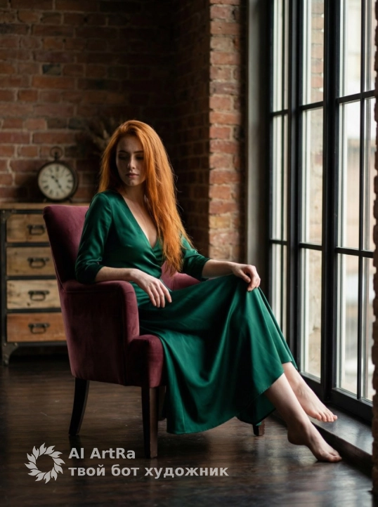 Не меняя внешности женщины с фото, в камерной сцене она сидит боком в кресле с бархатной винной обивкой у окна с тонкой черной рамой, через которое мягкий естественный свет равномерно освещает ее фигуру, создавая тени и подчеркивая текстуру изумрудного гладкого платья с рукавами ниже локтя и глубоким вырезом. Оголенные босые ноги протянуты вперед, волосы свободно падают на плечи, мягкий свет и полутени скрывают часть лица, избегая прямого взгляда, придавая образу загадочность. Позади интерьер в стиле лофта с кирпичной стеной, винтажные часы и деревянный комод с металлическими вставками размыты, фокус на женской фигуре. Темный пол с отражением света из окна, мягкий свет справа подчеркивает контуры тела и кресла, теплые глубокие тона, интимный мечтательный настрой, фотореалистично, высокая текстурная детализация, 4K.