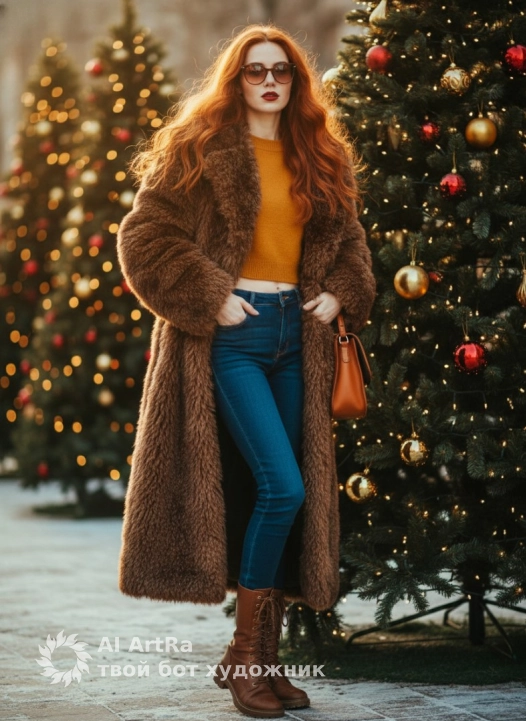 Не меняя внешности женщины с фото, перед нами предстает стройная девушка с волосами, свободно спадающими на плечи и развевающимися на ветру. Она стоит в полный рост возле украшенной новогодней ели, источающей атмосферу праздника и зимнего уюта, окутавшего её мягким светом с легкой золотистой теплотой. Взгляд её скрыт за стильными крупными солнцезащитными очками в коричневой оправе с ярким акцентом, а губы выделены глубоким красным оттенком помады, что придает облику дерзкий и уверенный характер. Девушка одета в длинное, пушистое коричневое пальто из искусственного меха, заметно мягкое и теплое, с фактурой, которая визуально ощущается как густая и объемная. Под пальто виден тонкий укороченный свитер горчичного оттенка, облегающий верхнюю часть тела и обнажающий тонкую талию с небольшим живым изгибом. На ней надеты темно-синие джинсы высокой посадки с едва заметной потертостью на бедре, плотно облегающие ноги и подчеркивающие стройность силуэта. Ноги девушки обуты в высокие коричневые ботинки на шнуровке с устойчивым каблуком, которые гармонично дополняют её наряд, добавляя немного брутальности и практичности. Руки девушки находятся в карманах пальто, создавая расслабленную и уверенную позу, слегка наклоненную вперед. На плече висит ярко-коричневая сумка с тиснением под кожу, частично скрытая пальто, с мягким блеском, показывающая качественный материал и классический стиль. Задний план окутан зимней тематикой с елями, украшенными красными и золотыми шарами и гирляндами, на земле видны легкие следы инея и снега, а прохладная, слегка расплывчатая зимняя сцена увеличивает интенсивность теплых оттенков и создаёт тонкое, загадочное настроение сказочности и праздничного ожидания. Вся композиция пронизана игрой теней и мягкого света, что привносит кинематографичную глубину снимку, делая образ женственным, теплым и одновременно энергичным, фотореалистичное изображение, высокая текстурная детализация, высокое качество, разрешение 4K.