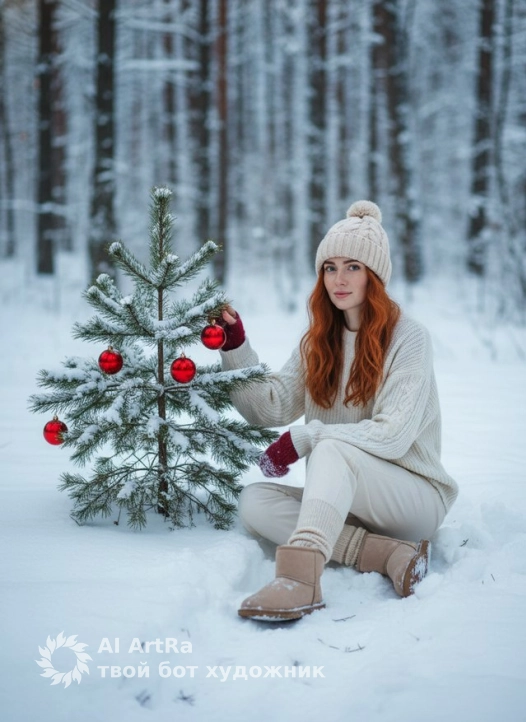 Зимний лес, много белого снега вокруг. Я сижу на снегу рядом с небольшой пушистой елью, украшенной красными шарами. Кадр в полный рост или обрезан чуть ниже колен. Корпус в лёгком пол-обороте к ёлке. Лицо хорошо видно: я поворачиваю голову к камере и смотрю в объектив мягким спокойным взглядом. Одной рукой тянусь к ветке с игрушкой, вторая свободно лежит на коленях.