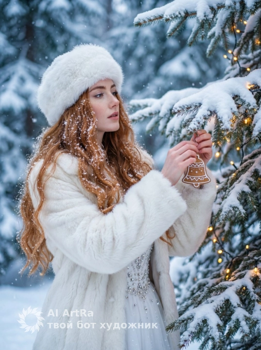 Не меняя внешности женщины с фото, сцена мягким морозным утром с тонким снежным покровом на густых еловых ветвях, окруженных тёплыми янтарными огоньками гирлянды, создающими сказочный свет. Женщина стоит боком, слегка наклонив голову, смотрит на развешиваемое пряничное украшение в виде колокольчика. Длинные светло-русые волосы волнами спадают по плечам и спине, мерцают в снежных блёсках, освещены рассеянным дневным светом, подчёркивающим нежность и задумчивость лица. Она в белоснежном платье с глубоким декольте, украшенном кристаллами и бусинами, дополненном пушистым белым меховым пальто и шапкой, контрастирующими с тканью платья. Руки аккуратно прикрепляют пряничные фигурки на снежные пушистые ветви, передавая волшебство подготовки к празднику. Фон — зимний лес с высокими заснеженными елями, слегка падающие снежинки добавляют движение и сказочность. Композиция передаёт спокойствие, нежность и зимнее волшебство, светлая палитра с прохладными голубыми тенями сохраняет ощущение холода. Фотореалистичное изображение, высокая текстурная детализация, качество 4K.