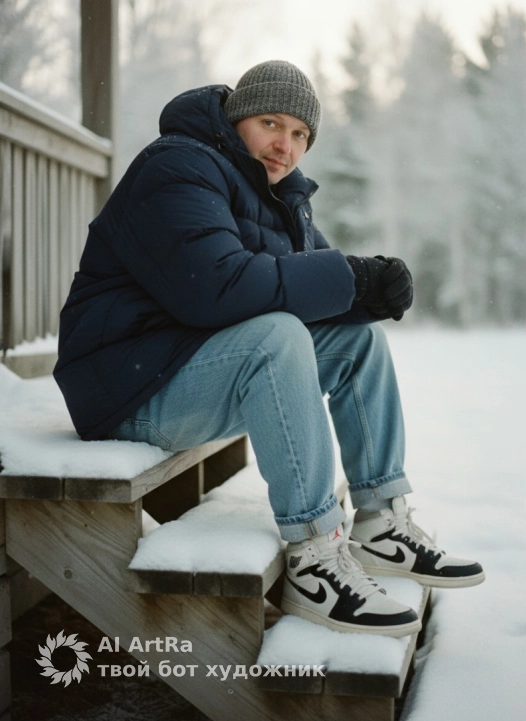 Pose: seated slightly sideways on snowy wooden porch steps, hands tucked into sleeves, shoulders hunched naturally from cold. Outfit: oversized navy puffer, knitted beanie, relaxed mom jeans cuffed over winter Jordans. Lighting: natural diffused morning light. Camera: close medium shot from slightly low angle. Mood: cozy winter realism, not staged.
