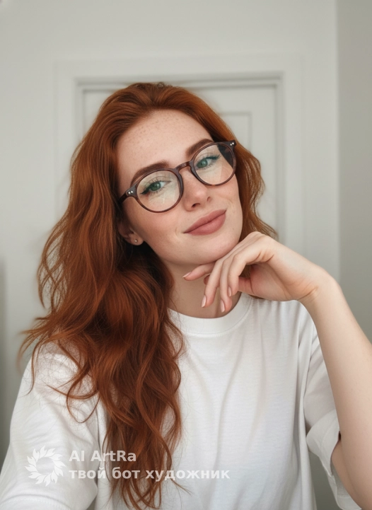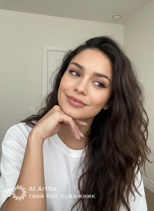 A close-up indoor photo of a woman looking playfully to the side, her head slightly tilted, her hand resting under her chin. Light makeup, an even matte skin tone, subtle eyeliner, mascara, and matte nude-pink lips. Her nails are manicured and painted a light polish. She is wearing a casual, oversized white T-shirt. The setting is bright and simple, homey. The background is blurred, revealing a plain white wall and part of a white interior door. Soft, diffused natural light (likely from a window) creates subtle highlights on her face and hair, with minimal, soft shadows. Shot with the front camera of an iPhone, the selfie is taken from a slightly above-the-shoulder angle, offering a photorealistic look.