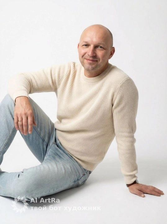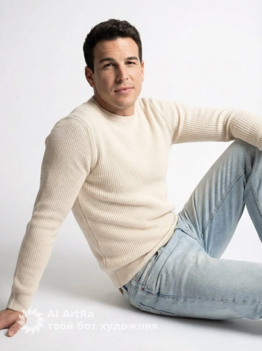 A clean white-studio portrait of a man sitting sideways on the floor, leaning back on one arm, posture relaxed yet confident.