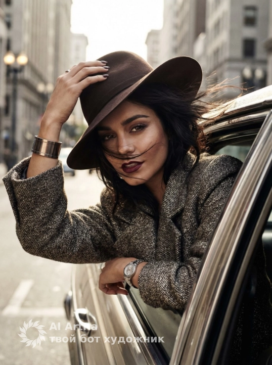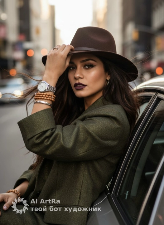 Не меняя внешности женщины с фото, кадр динамичного портрета на фоне городской сцены: модель облокачивается на край стекла автомобиля, волосы развеваются ветром, рука поднята к темно-коричневой шляпе, удерживая её. Глубокий макияж с акцентом на тёмные губы и выразительные глаза подчёркивает уверенность и загадочность. Верхняя одежда из толстого шероховатого материала с металлическим блеском контрастирует с гладким металлическим браслетом и часами на запястье. Мягкое, тёплое рассеянное освещение подчёркивает рельеф кожи и объём, световые блики на металле создают игру света и тени. Размытый серо-бежевый урбанистический фон сохраняет фокус на фигуре и динамичной позе. Тень от шляпы добавляет мистическую интригу. Кинематографический портрет, фотореалистичное изображение, высокая детализация, 4K.