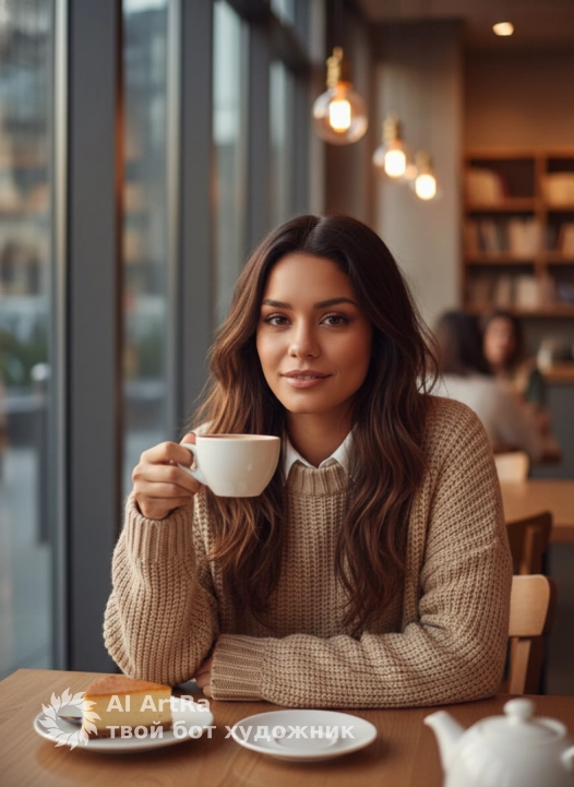 Set the scene in a modern café with large windows that let in natural light, creating a bright yet warm atmosphere. The interior is decorated in soft neutral tones with elements such as wood and soft lighting. The shooting time is evening, so the sunlight creates a cozy glow.
