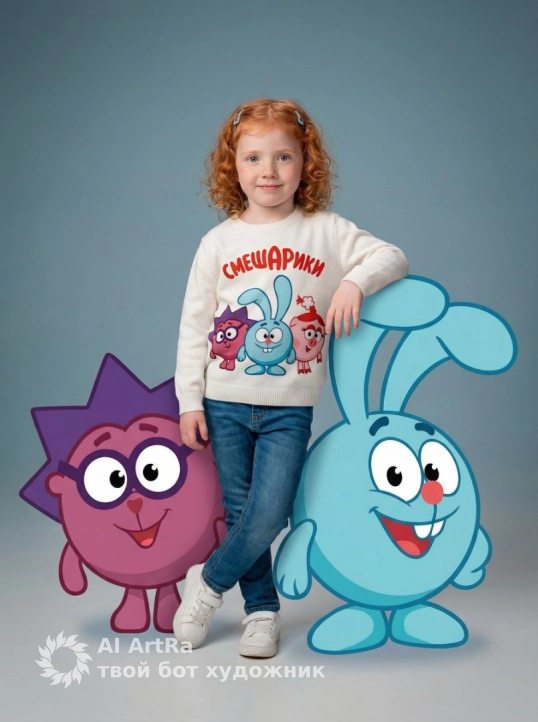 Человек, с абсолютно идентичным лицом, чертами лица, тоном кожи, прической и пропорциями тела, как у эталонного изображения, без каких-либо изменений, переосмыслений или стилизации, стоит рядом с крупными анимационными персонажами из франшизы Смешарики.